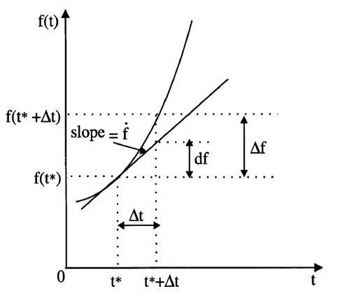 Here, df is called the differential of the function at the point t*, and ḟ(t*) is the derivative or slope of f at t*.